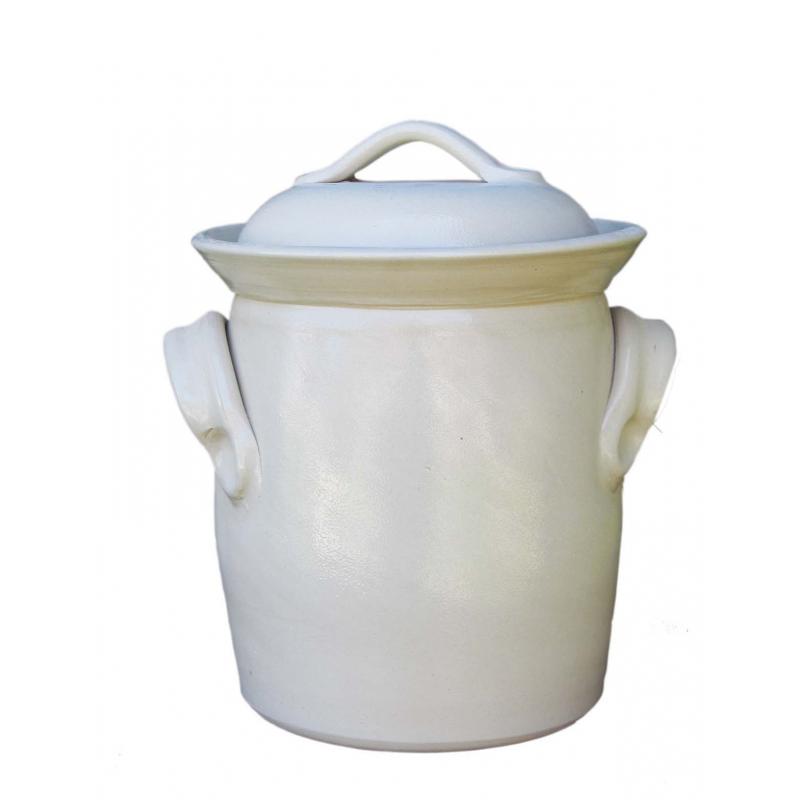 Les pots en grès à joint hydraulique participent à la bonne fermentation des végétaux, ce joint consiste en une gorge circulaire façonnée autour de l’ouverture. Cette partie creuse dans laquelle repose la bordure du couvercle sera en permanence remplie d’eau, empêchant ainsi l’air de pénétrer à l’intérieur et d’activer la fermentation. Deux pierres d'appui complètent l'équipement; elles permettent de maintenir les végétaux immergés et accélèrent ainsi le processus de fermentation.
